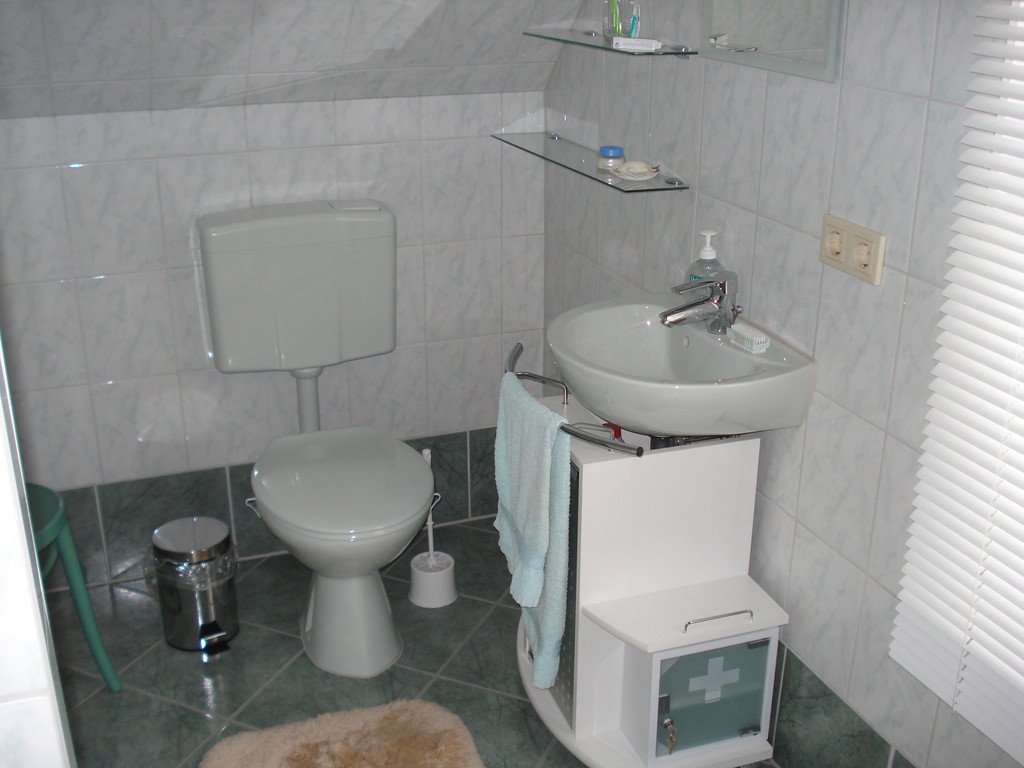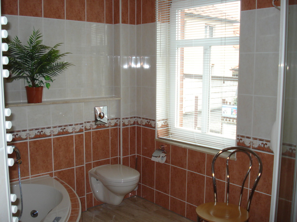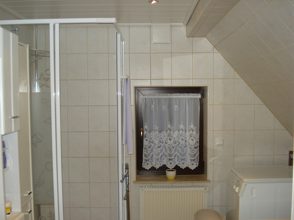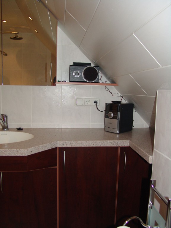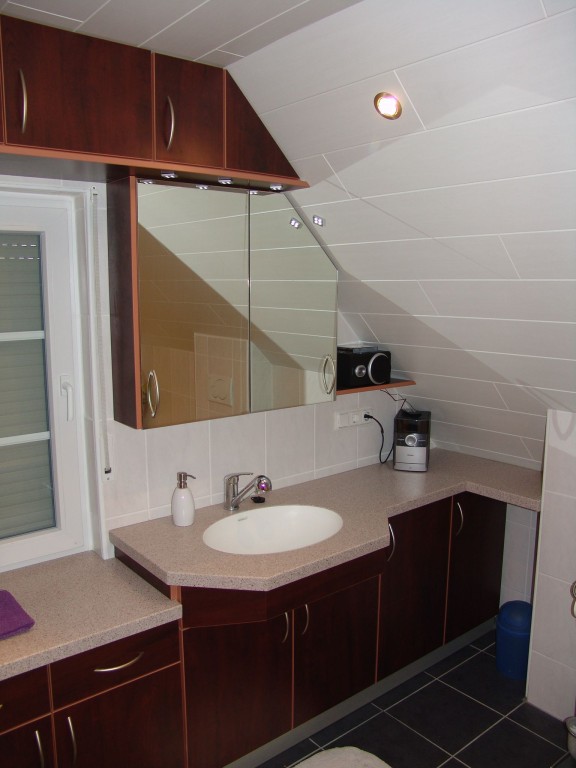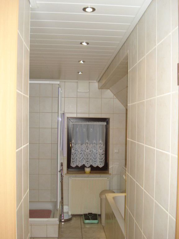 Bad im Dachgeschoß mit gefliester Balkenverkleidung.