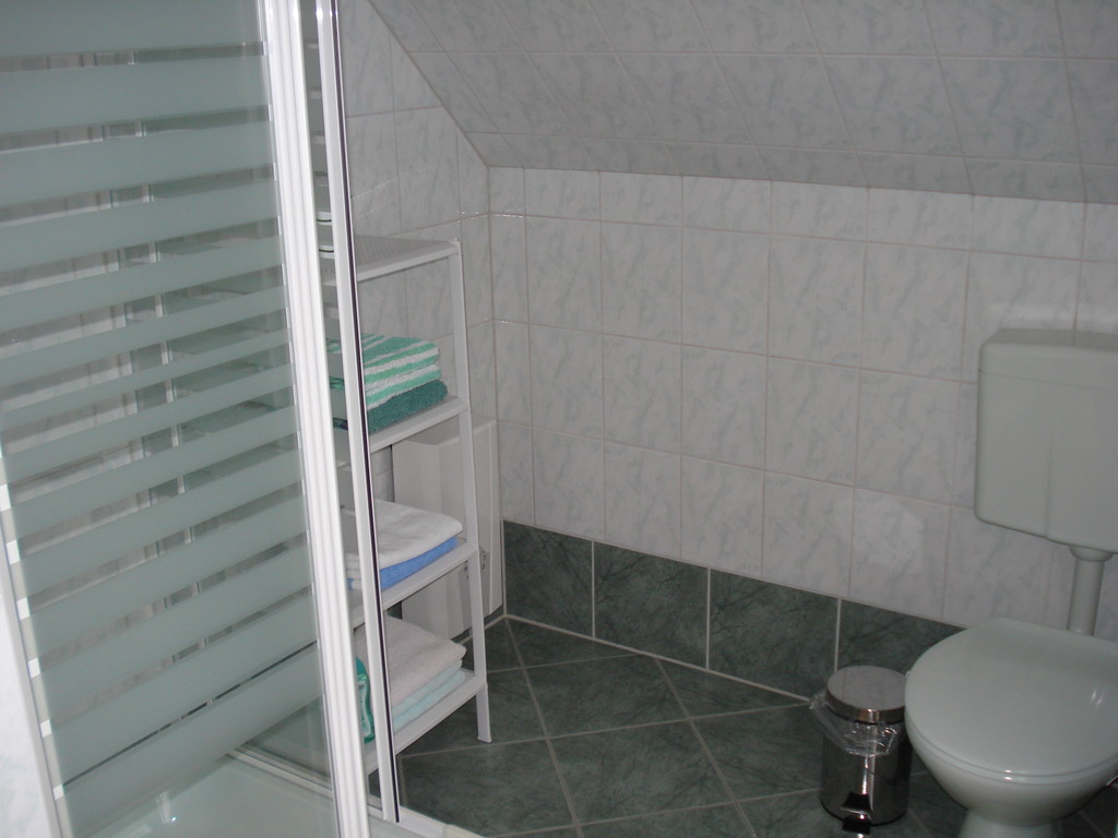 Bad mit Dachschräge und bodennaher Fliesenbordüre.