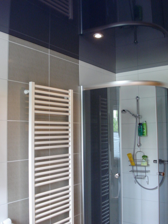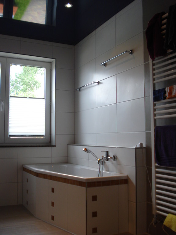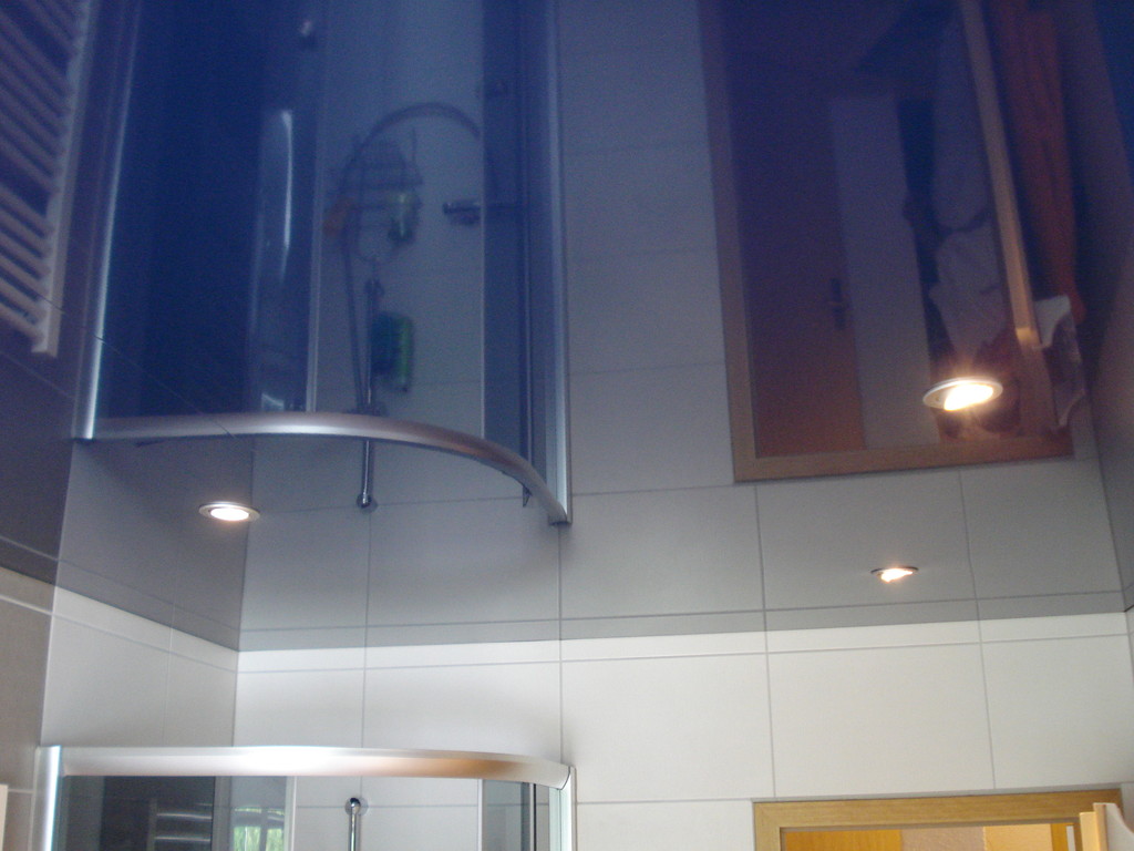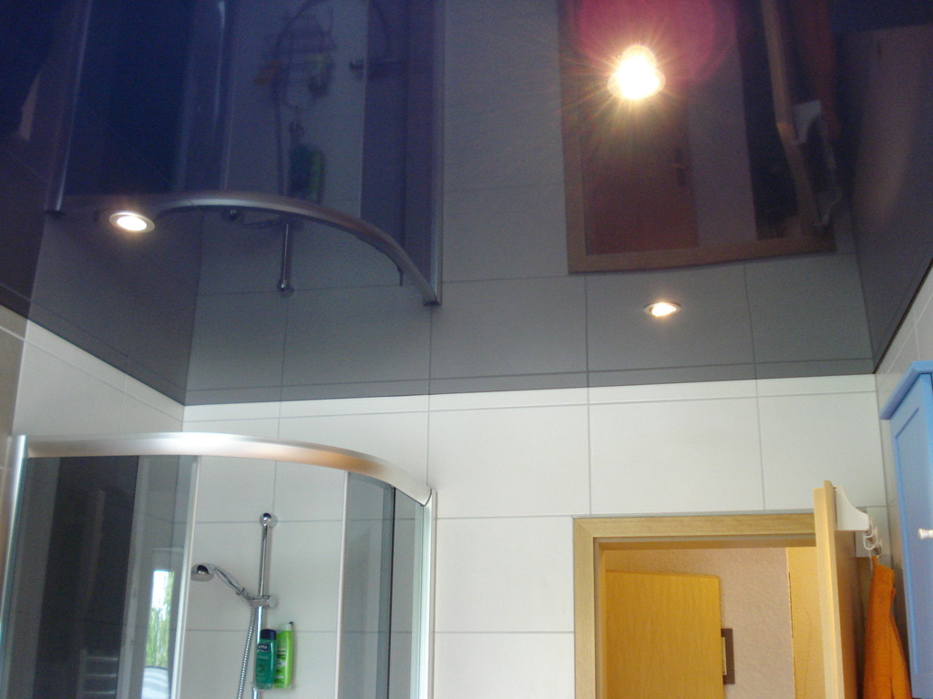 Modernes Bad mit einer blauen Hochglanz- Spanndecke.